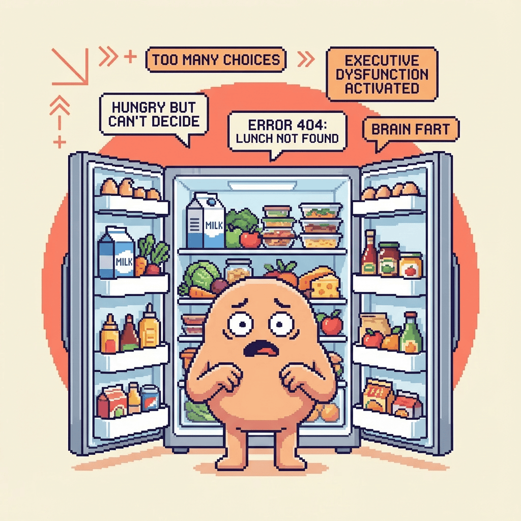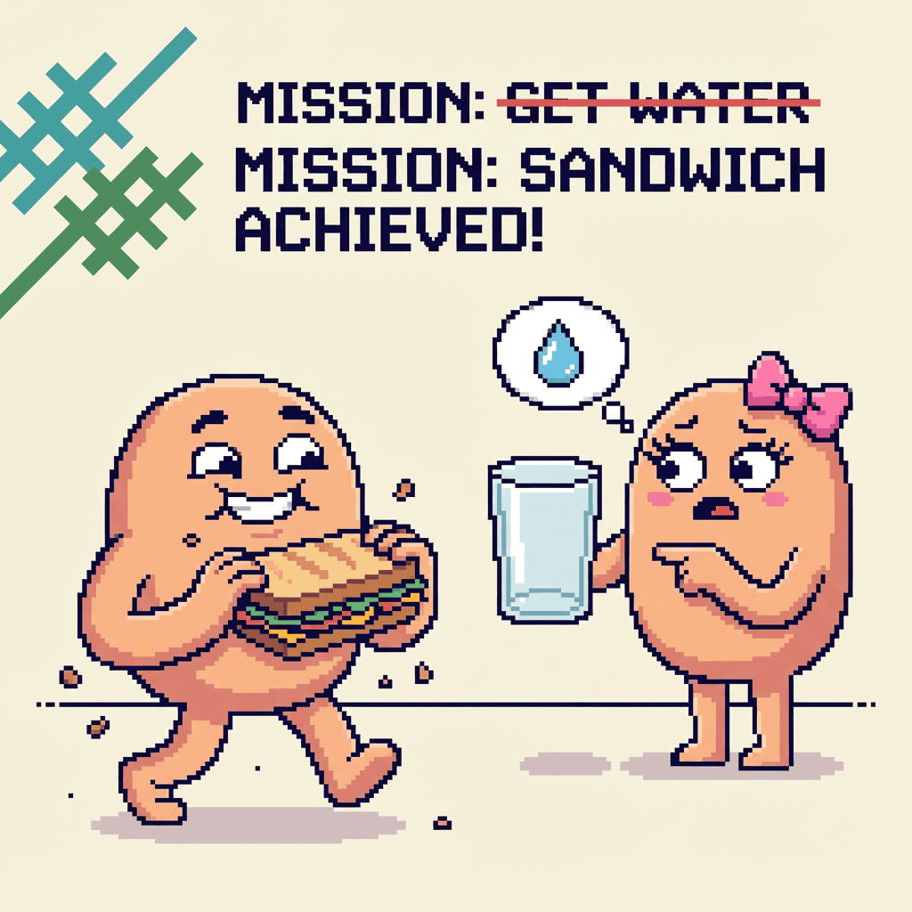 ✓ Your partner asks for water. You nod, walk to the kitchen, and return with a sandwich. For yourself. They're still thirsty. You have no way to explain.